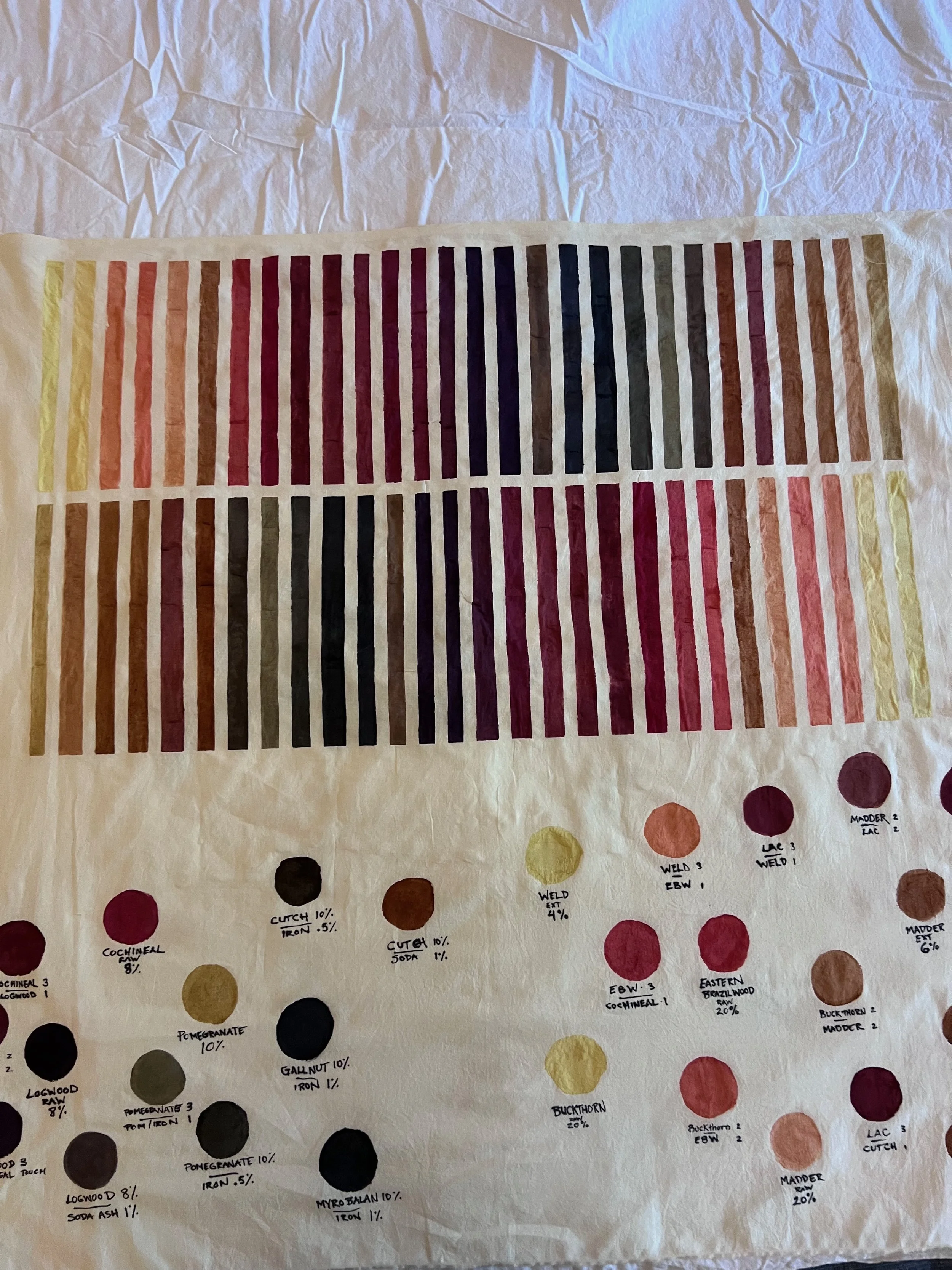 Natural dye colors are susceptible to many factors. The water PH, environment during dyeing, material batch, etc can all shift colors. Even using the same techniques and recipes can deliver slightly different colors from project to project. This is expected with this process and not a defect. It can be difficult to match previous colors, and is best to embrace this natural aspect of the technique.