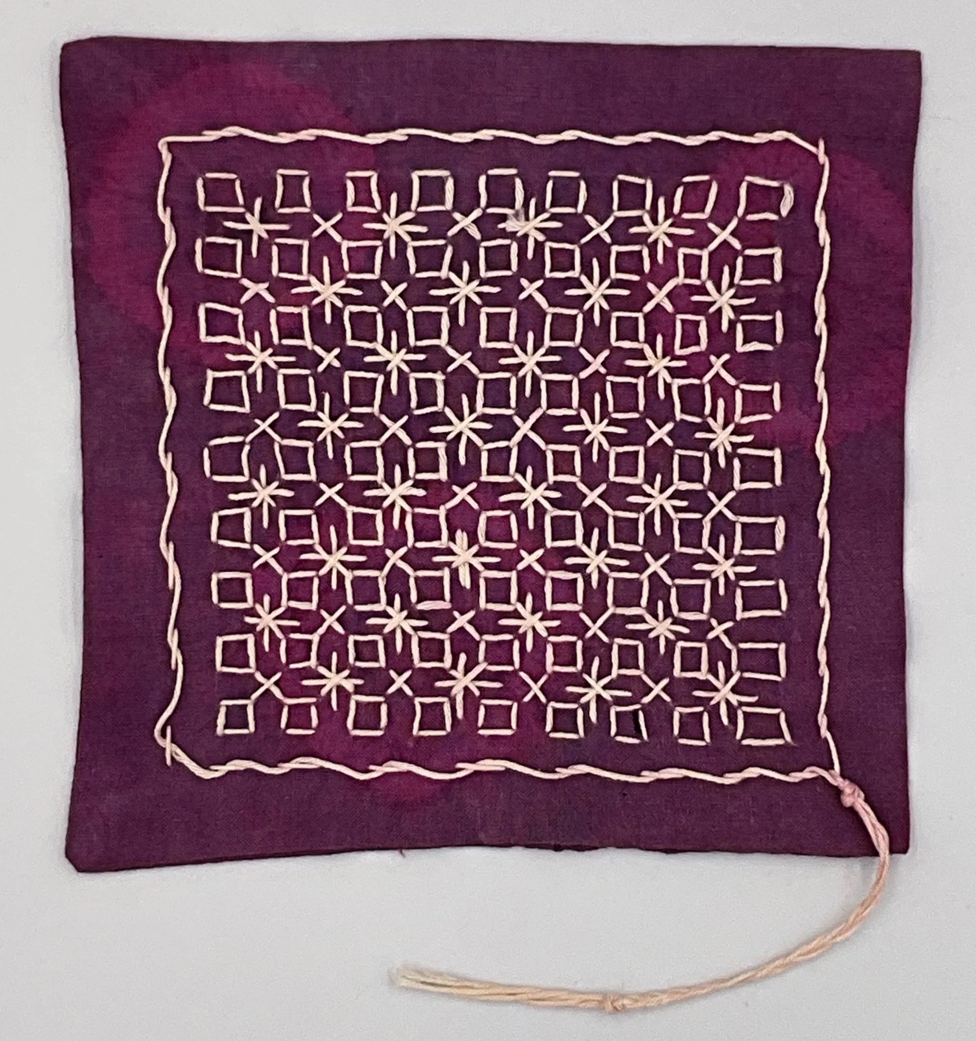 This was my first Sashiko Hana Fukin piece. I made this as part of a Sashiko stitching community challenge. The pattern is called Zenizashi. Zenisashi breaks down to ‘Zeni’ meaning money or coins, and ‘sashi’ meaning to string. This refers to the tradition of stringing coins together.