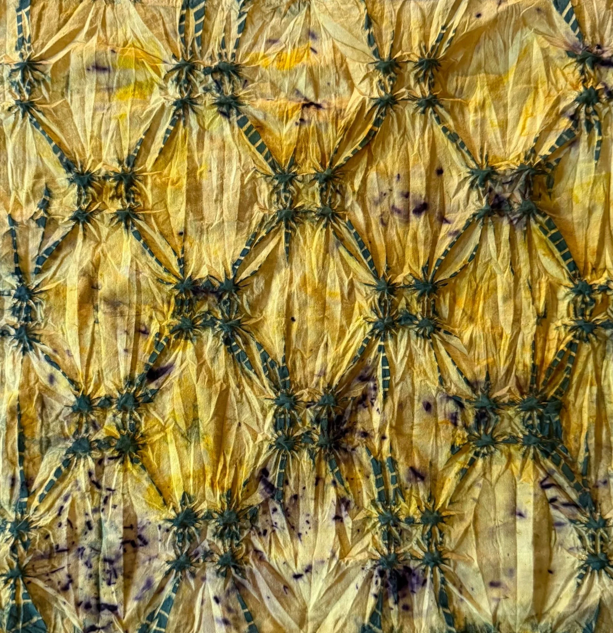 I recently applied this shibori onto a piece of cotton that I ecodyed using Logwood and Golden Marguerite (dyers chamomile). I have been growing golden marguerites in my. garden for 4 years, and the flowers create a beautiful bright yellow that pairs so well with the purple of logwood. I applied the shibori to this piece, and then dipped it into Indigo to overdye. The Indigo mixed with the yellow to create a beautiful green color- very rich and earthy.