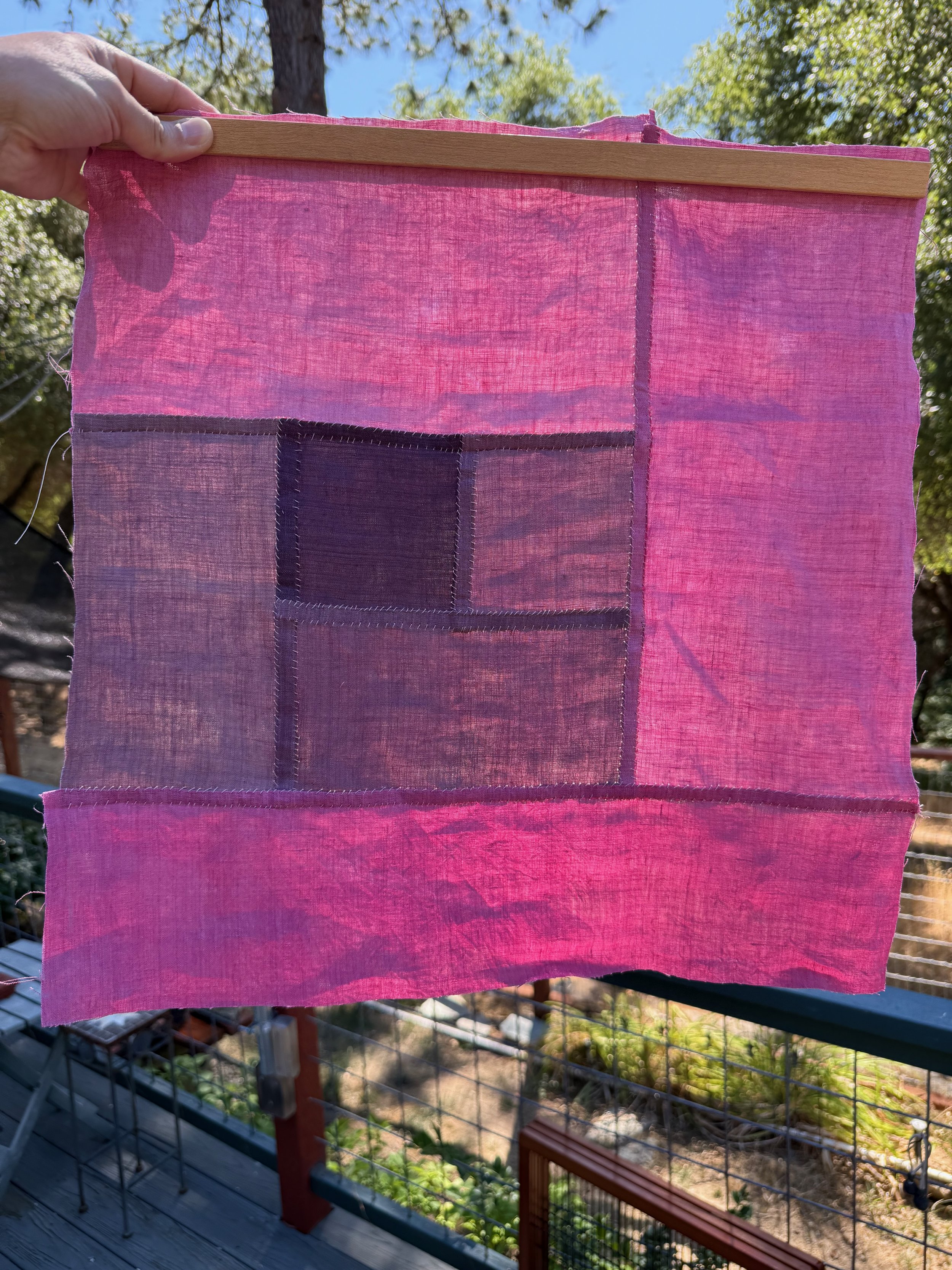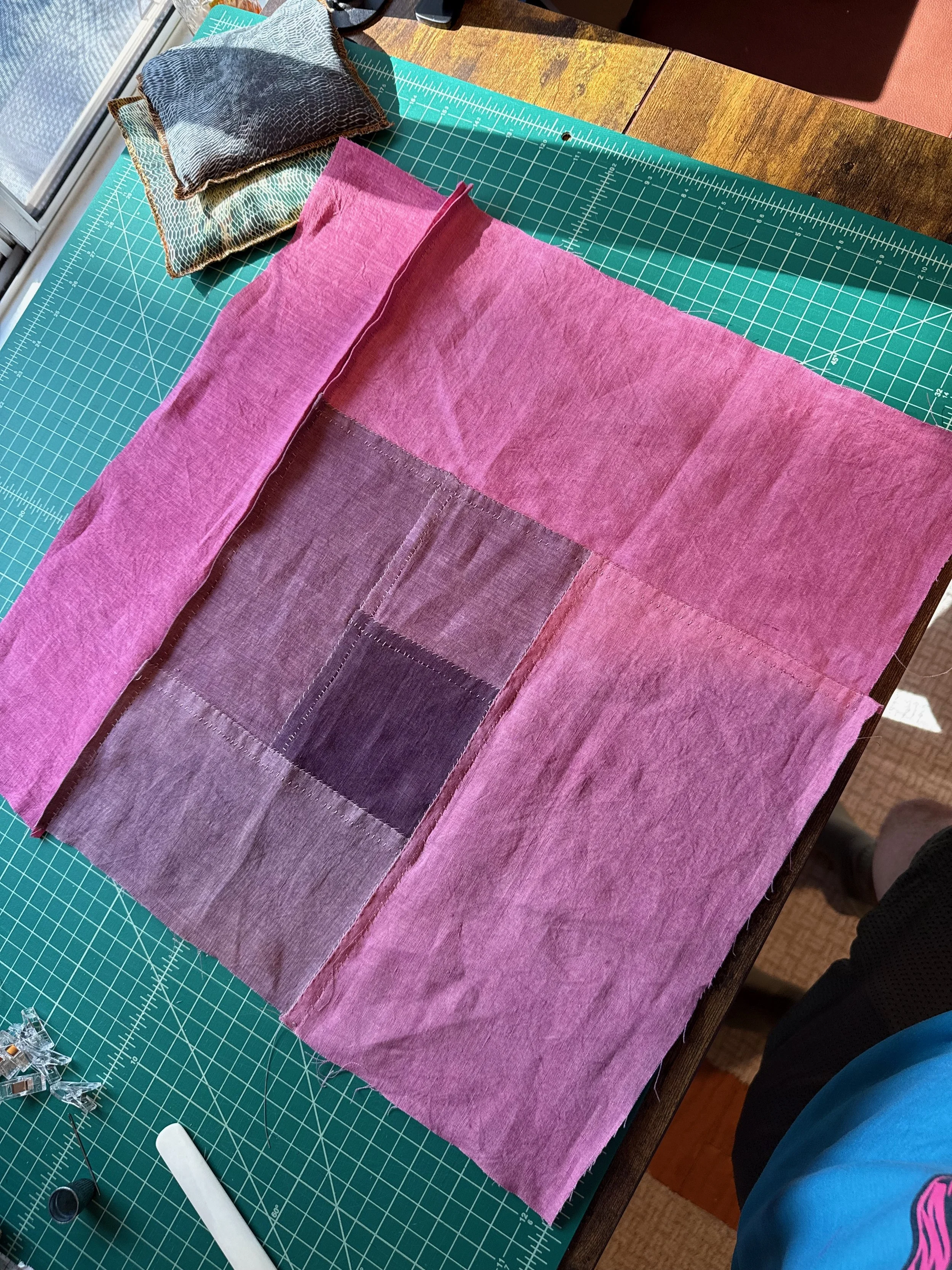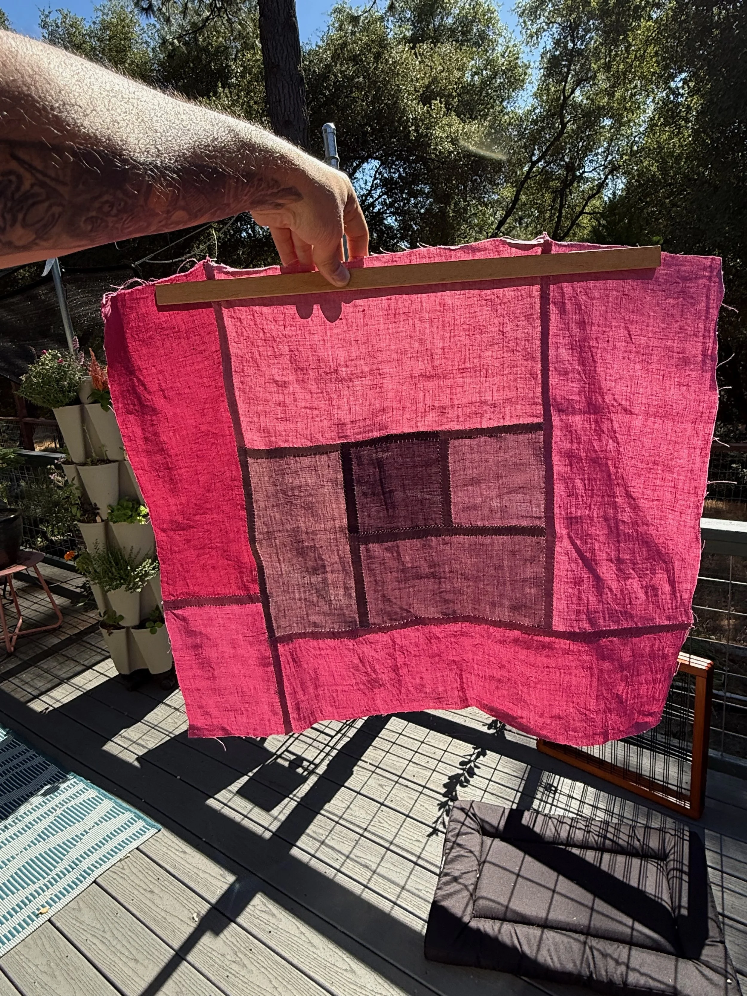 I created a Bojagi piece using my color range of Cochineal at various tannin and mordant steeping times & ferrous sulfate color shifts on handwoven linen.