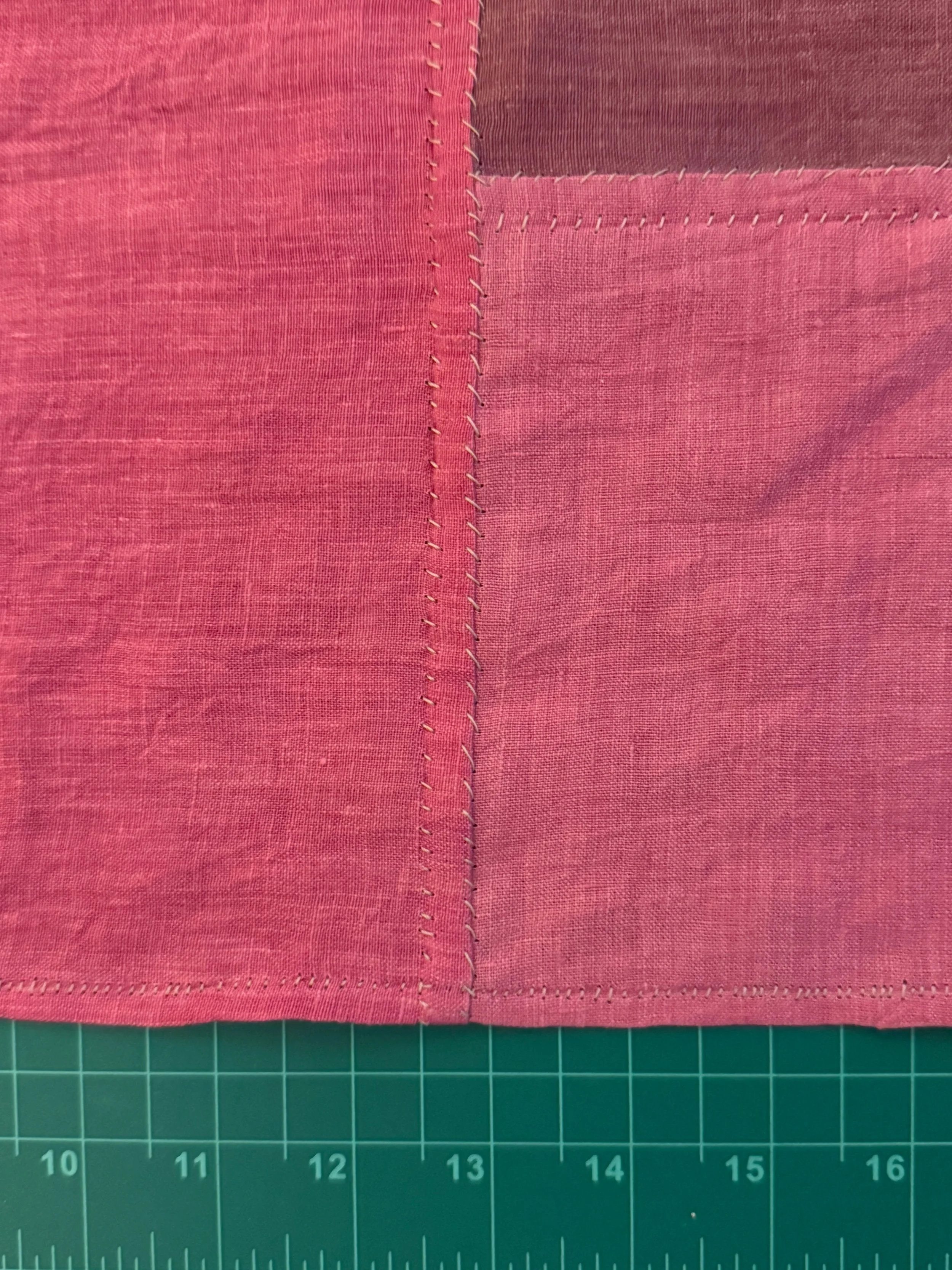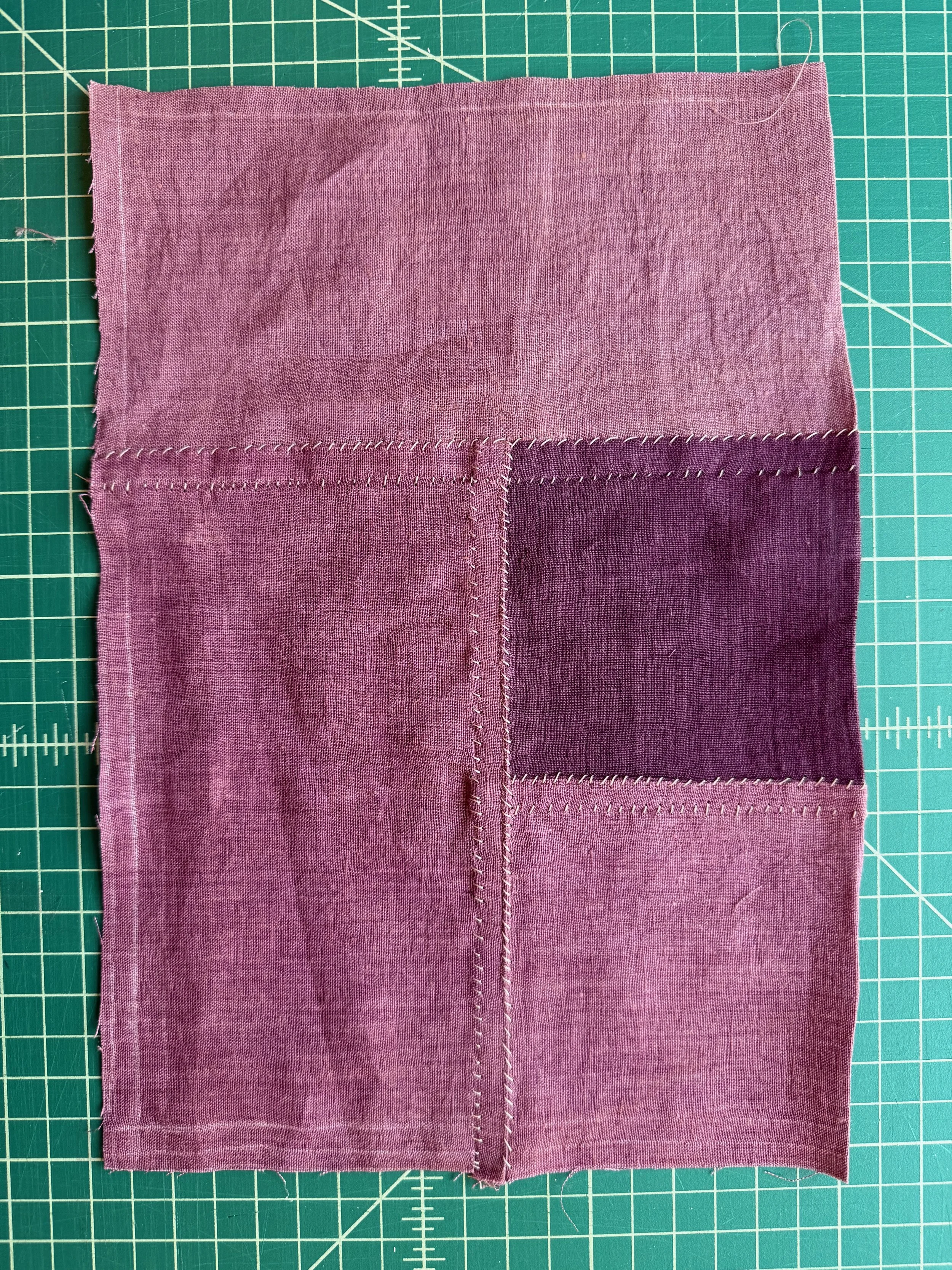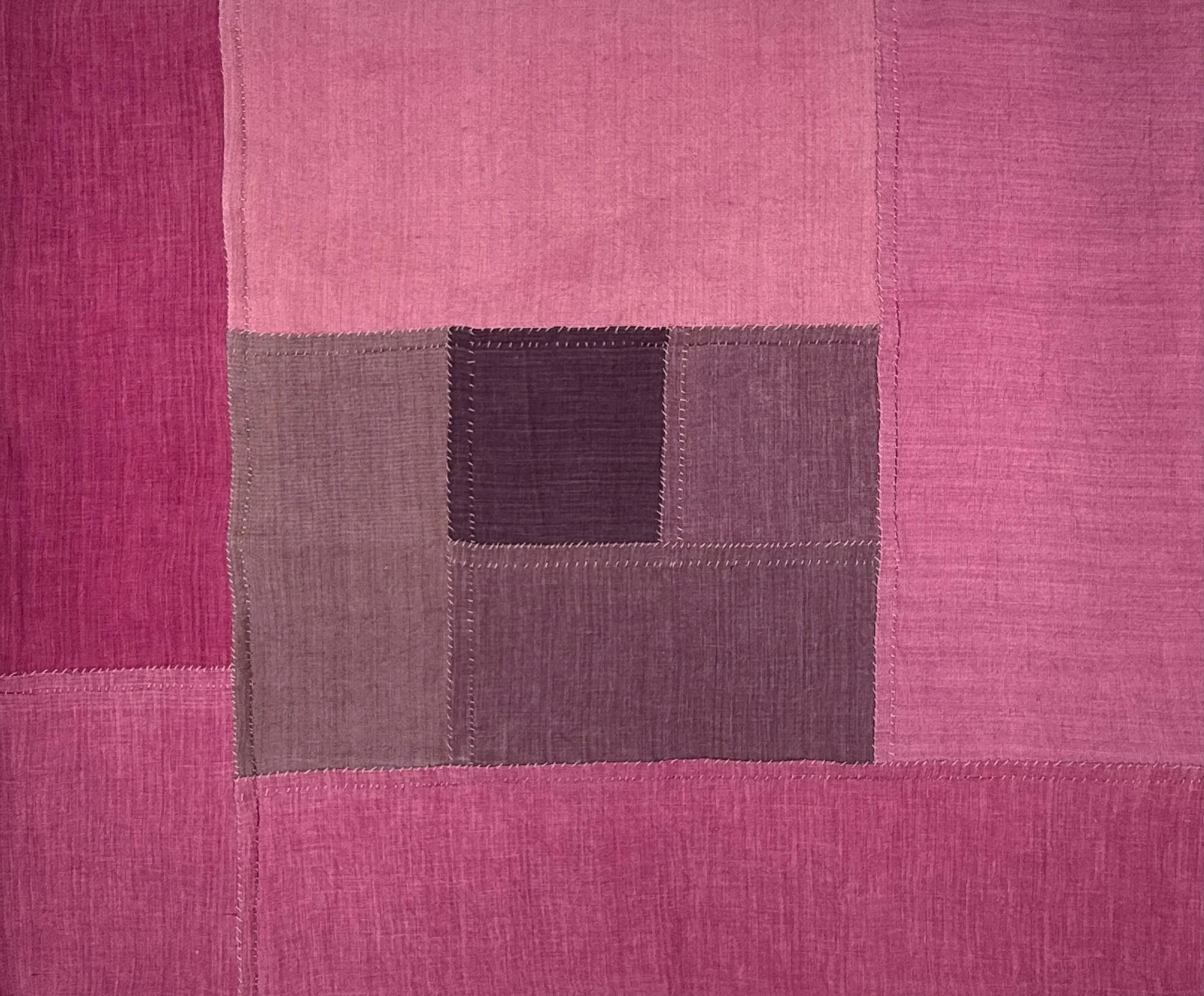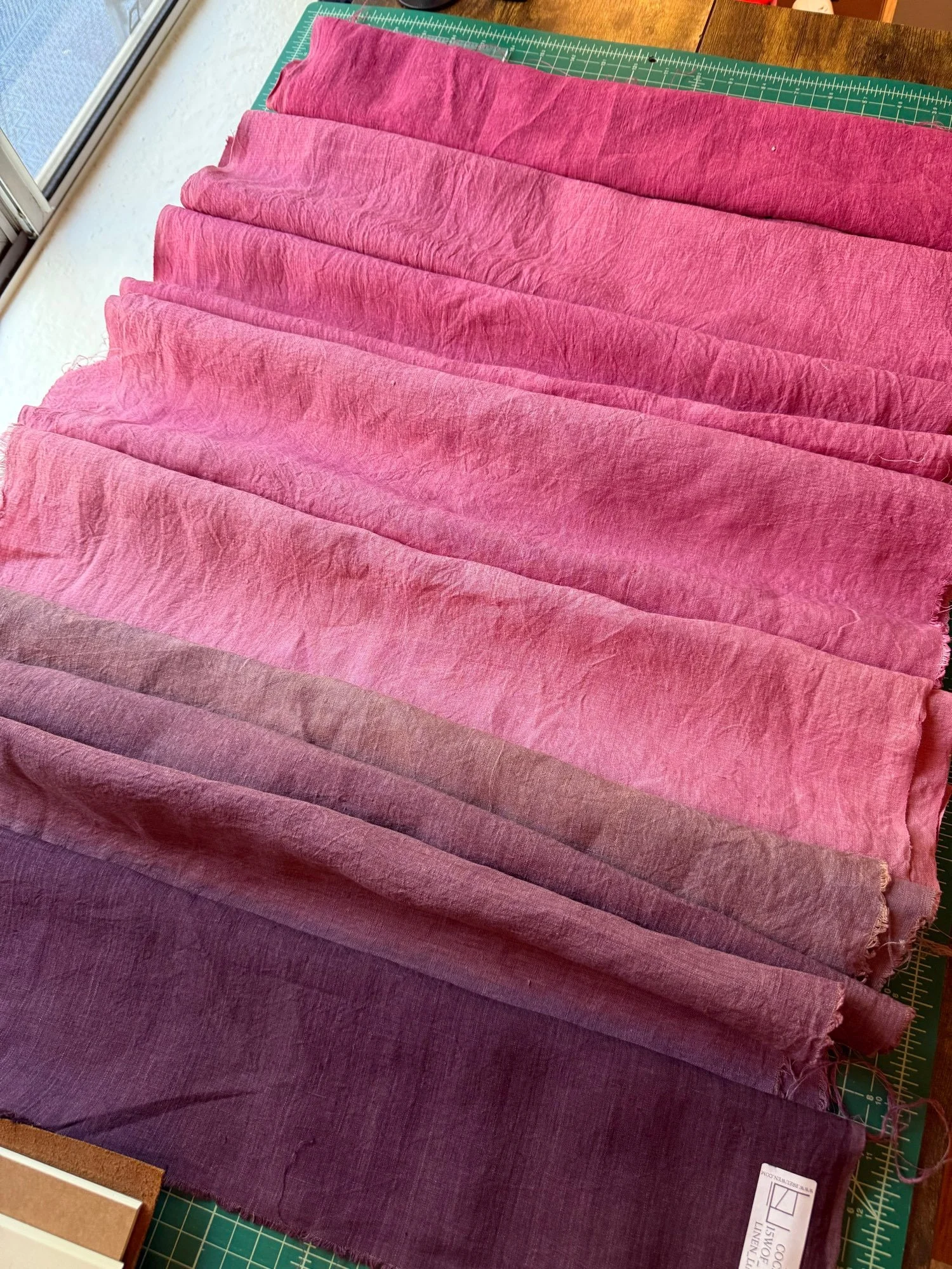 I created a Bojagi piece using my color range of Cochineal at various tannin and mordant steeping times & ferrous sulfate color shifts on handwoven linen.