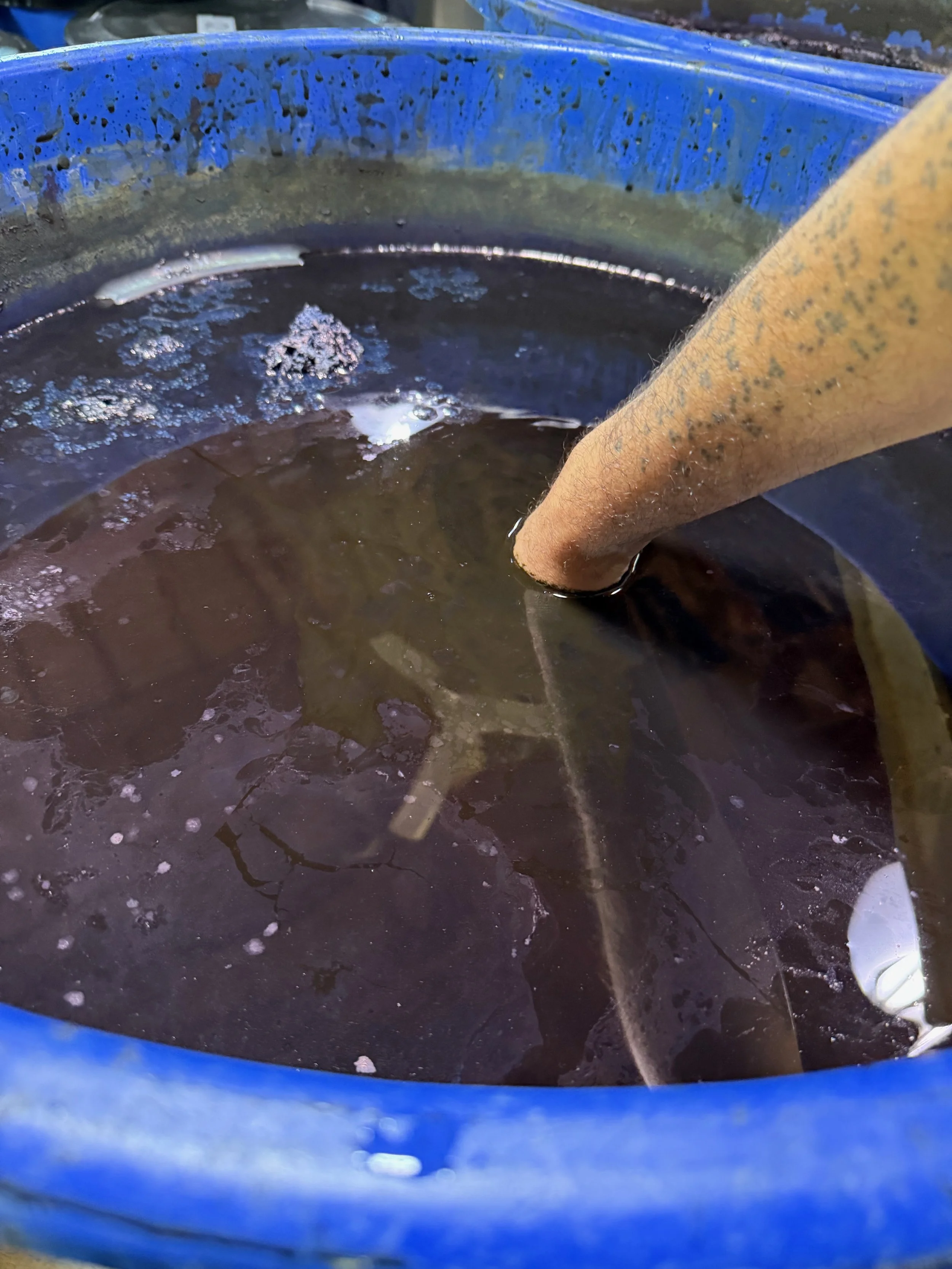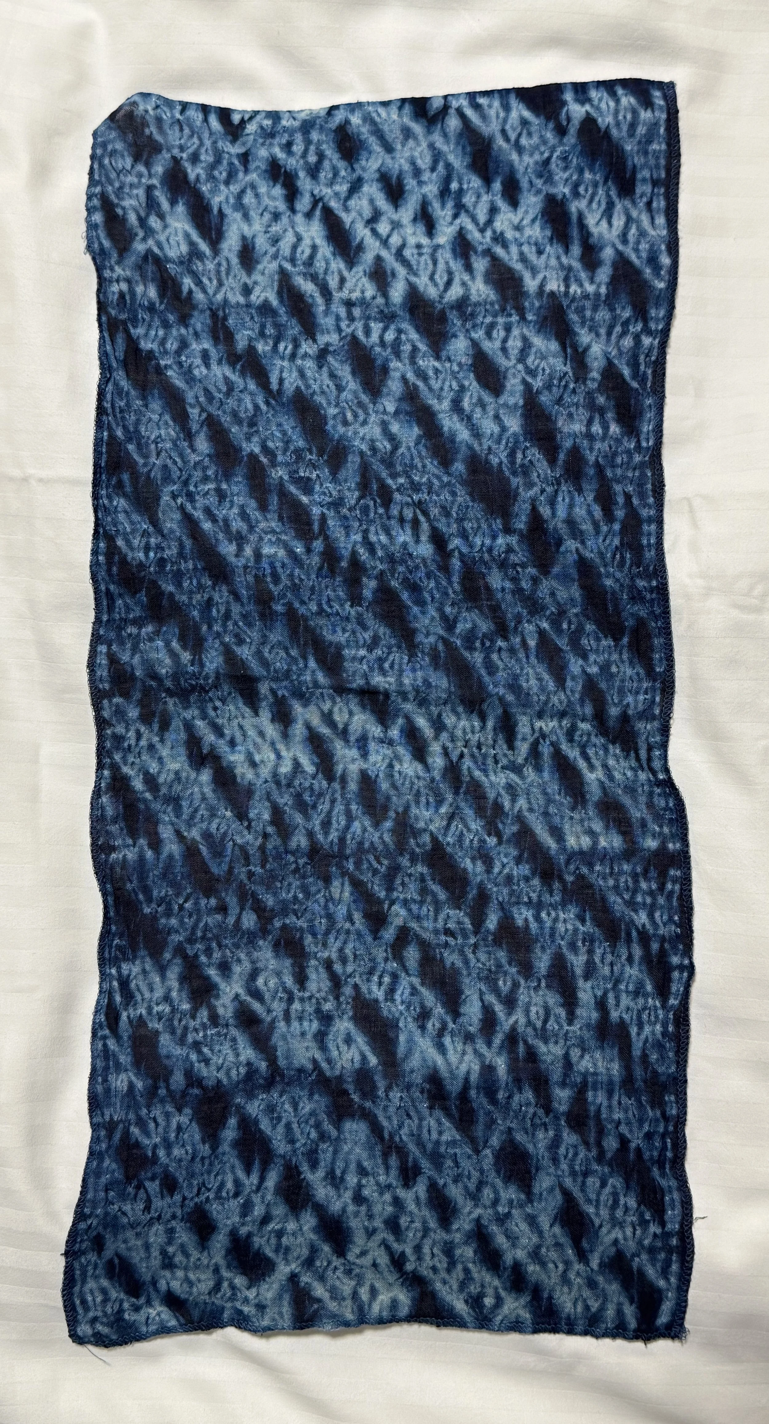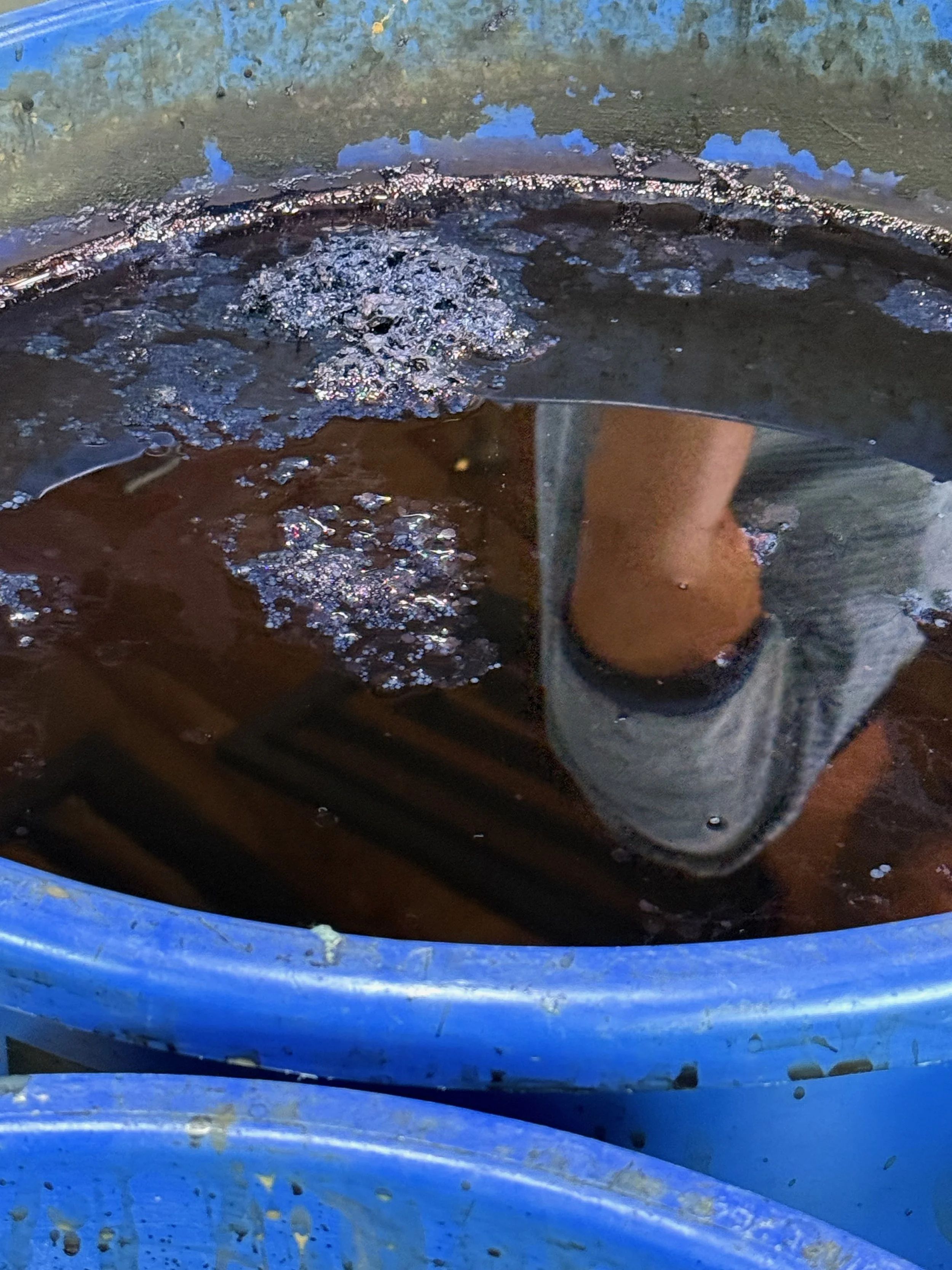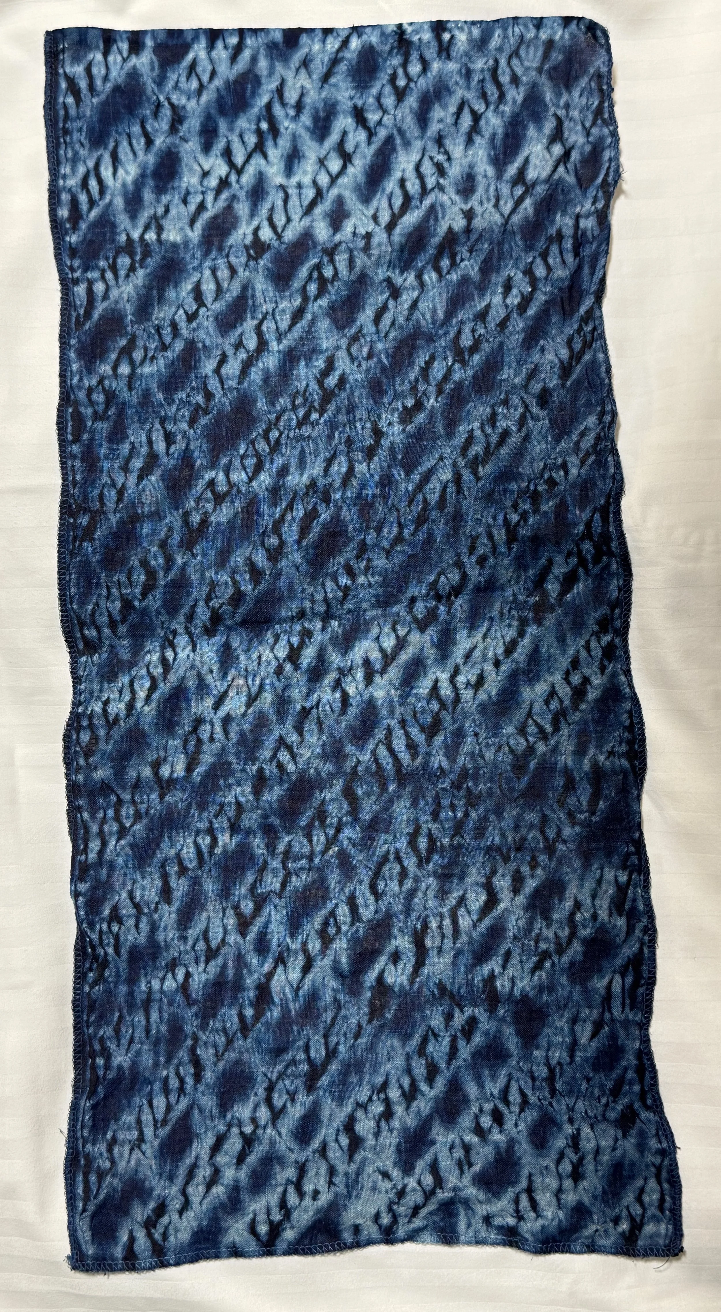 I brought a shibori piece I prepared for the workshop from Awonoyoh’s Shibori subscription, Taka Ishii Shibori 03. It is a beautiful pattern that is also reversible. I stitched the pattern before we left for Japan and brought it with the intention of dyeing it at Watanabes because of the different Indigo vat they use. At home I’ve been using powdered Indian Indigo, but Japan’s Sukumo vat dyeing is an entirely different experience. Sukumo Indigo is a fermented vat, the way it’s created and maintained is an art in itself. The vat that I dyed with has been in use for about a year at that point, compared to the Indigo vats I make at home which I usually only maintain for a month or two. The organic nature of the vat, the way it smells, and the feel of the Indigo against my hands is entirely different.