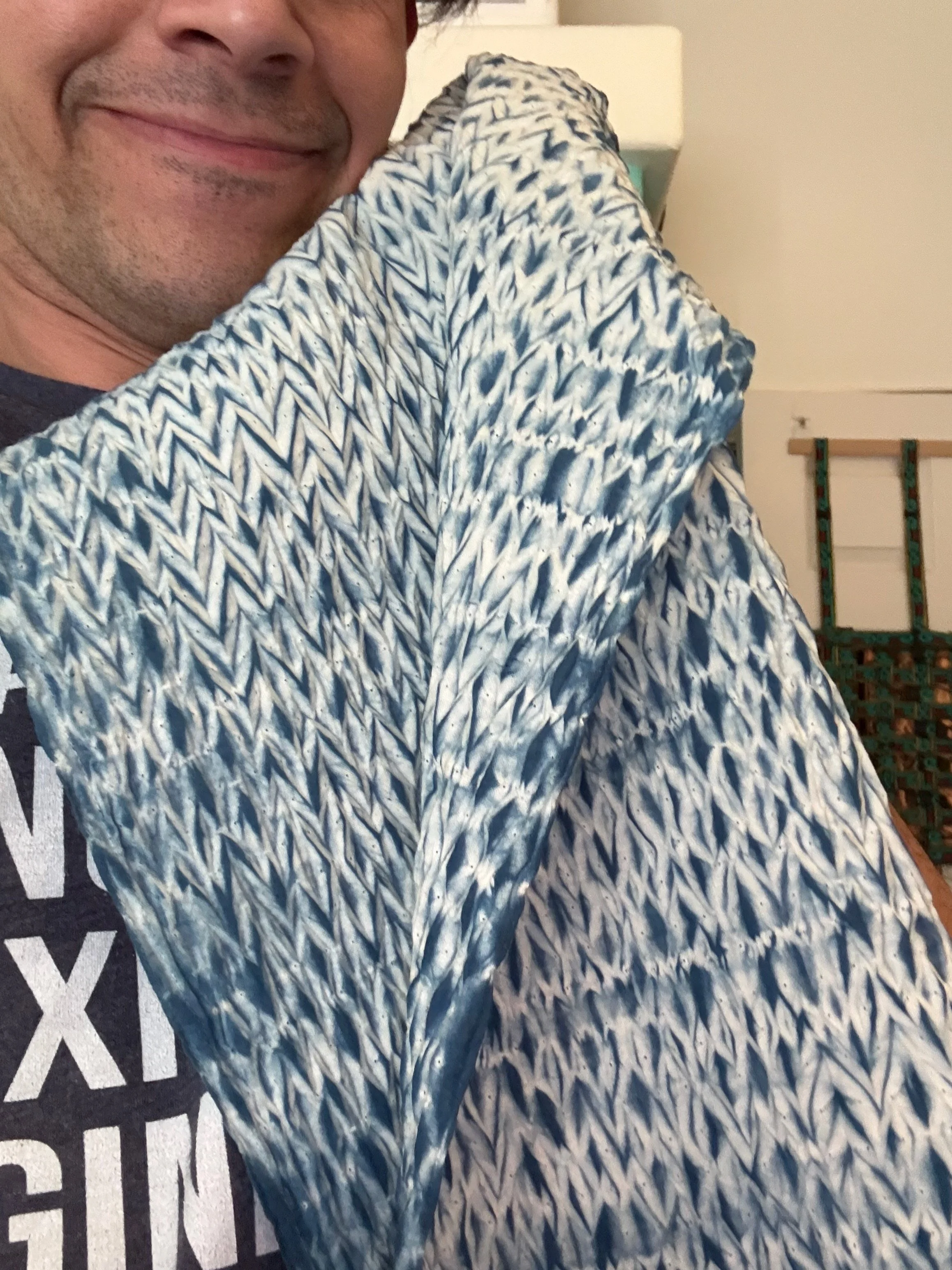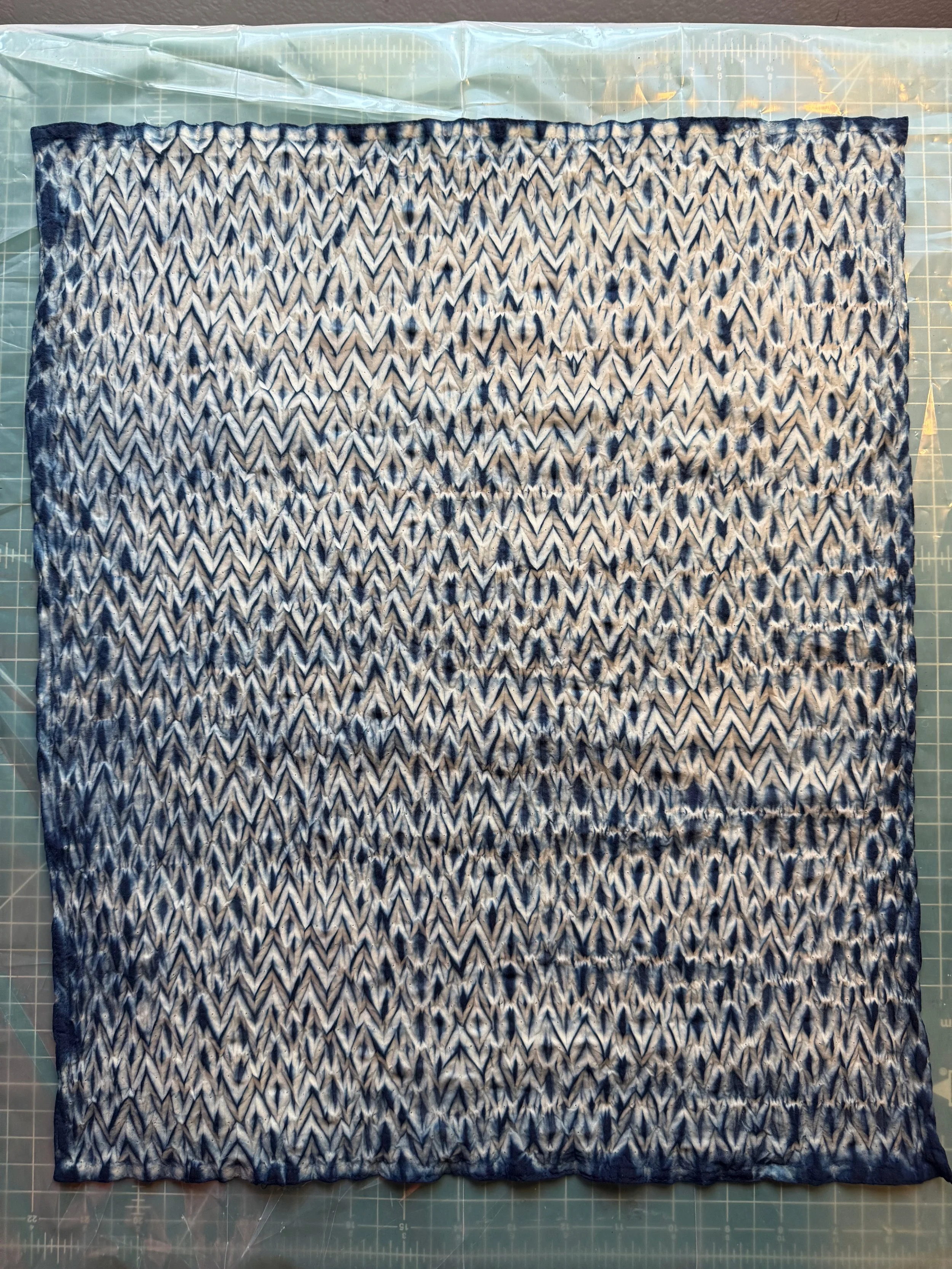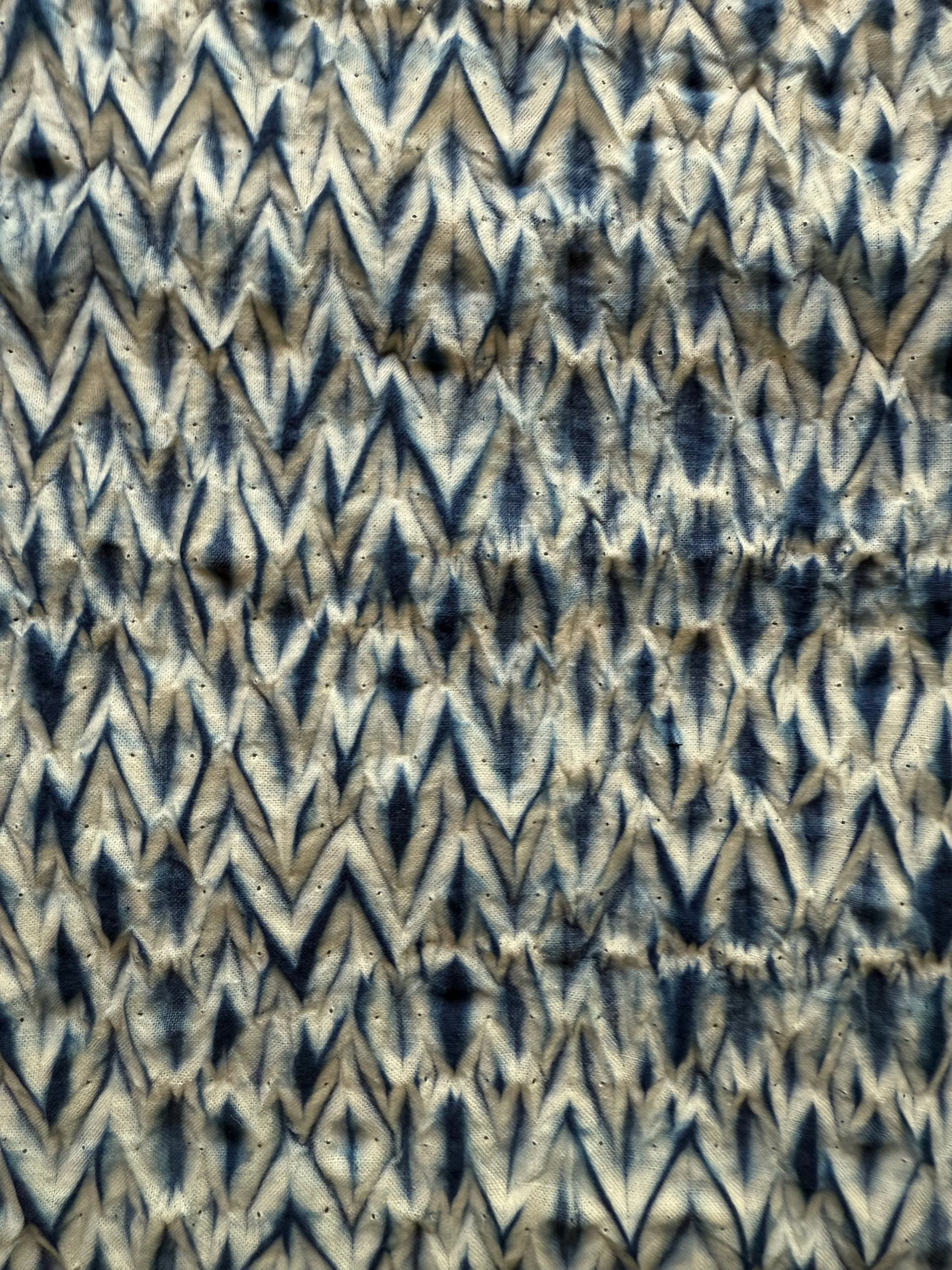 I dyed this 5 times in my Indigo vat. I love the way this pattern pleated after the dyeing process, and I’m reluctant to press it so I have kept it as it is for now.