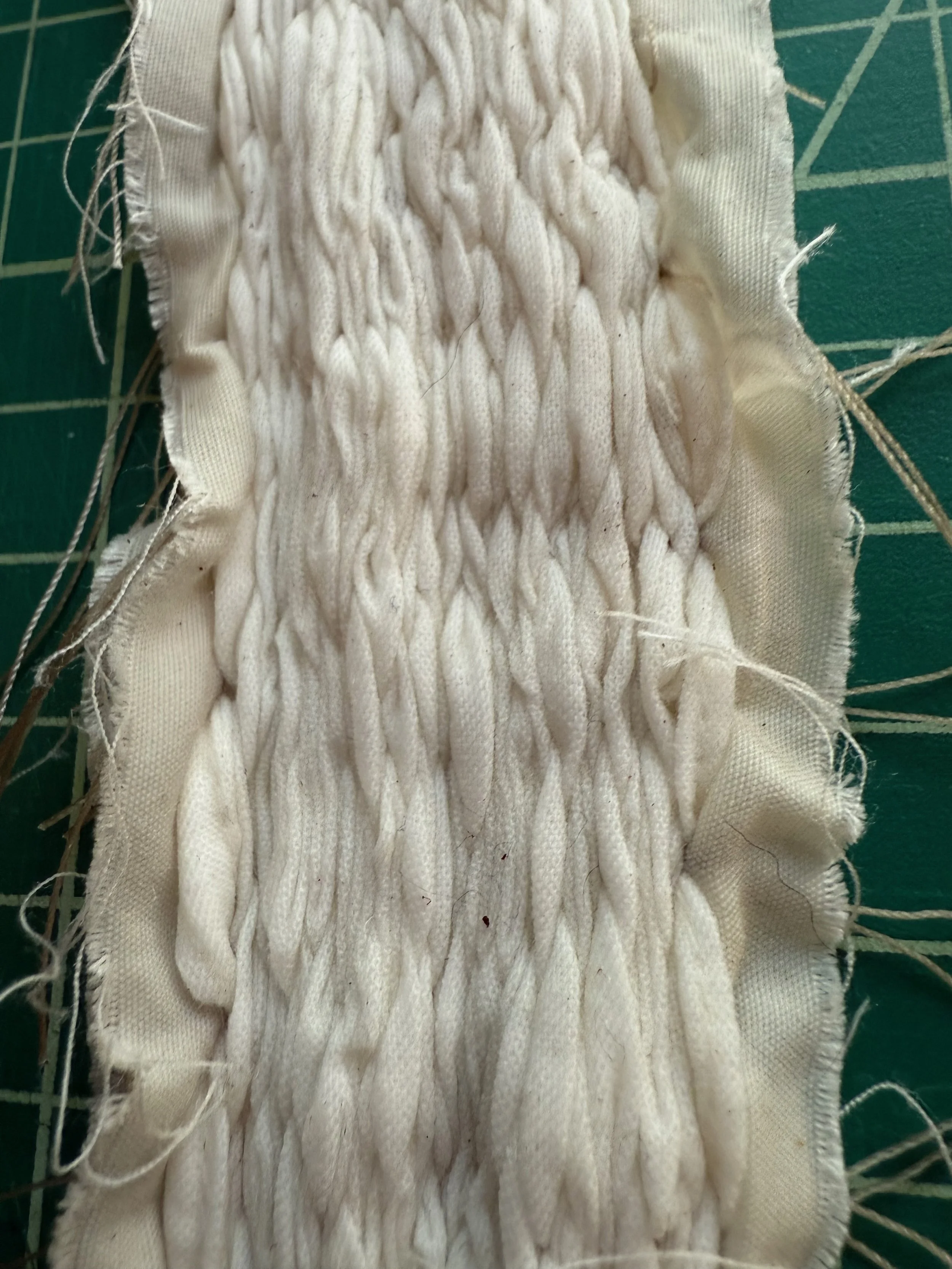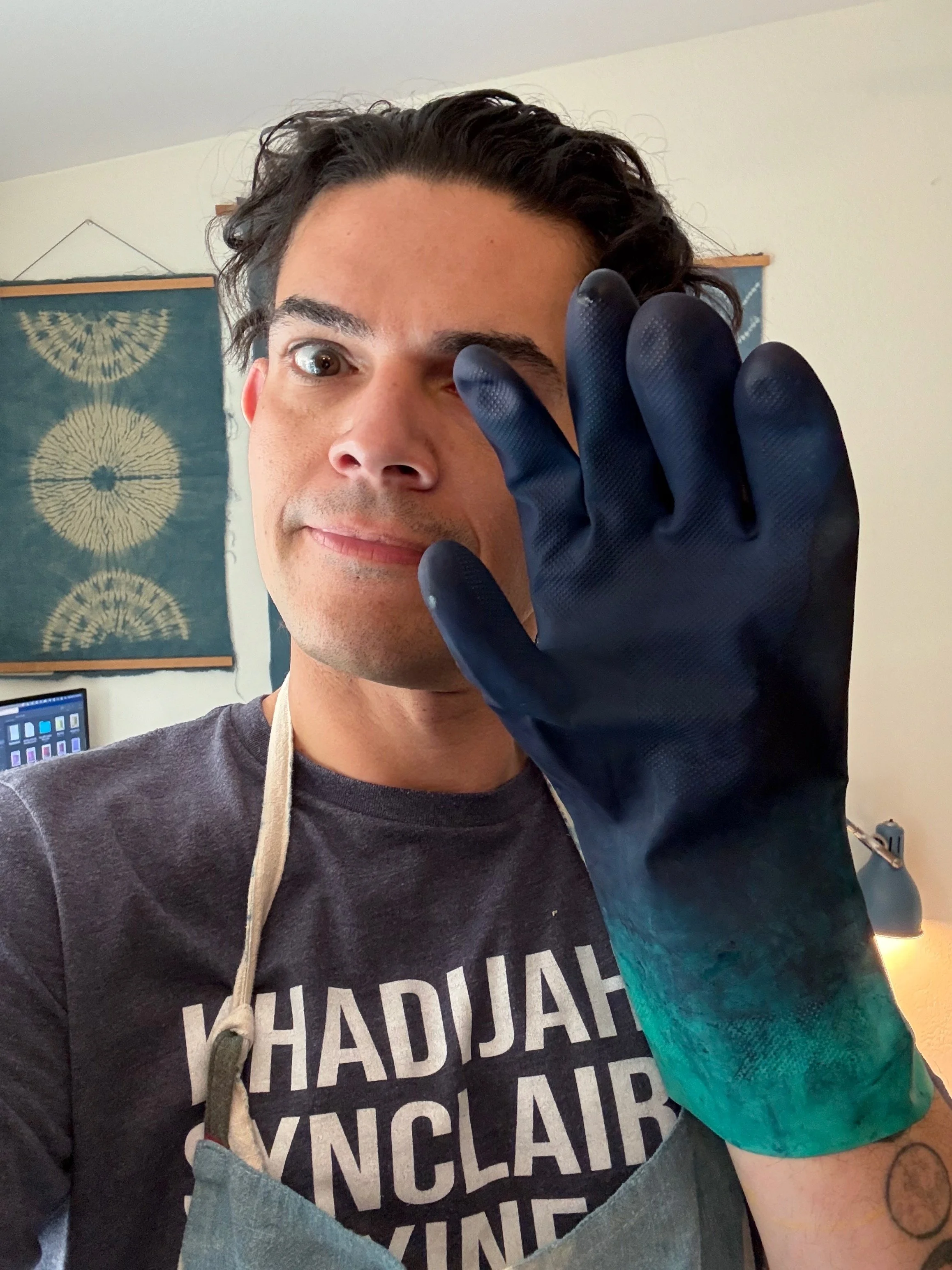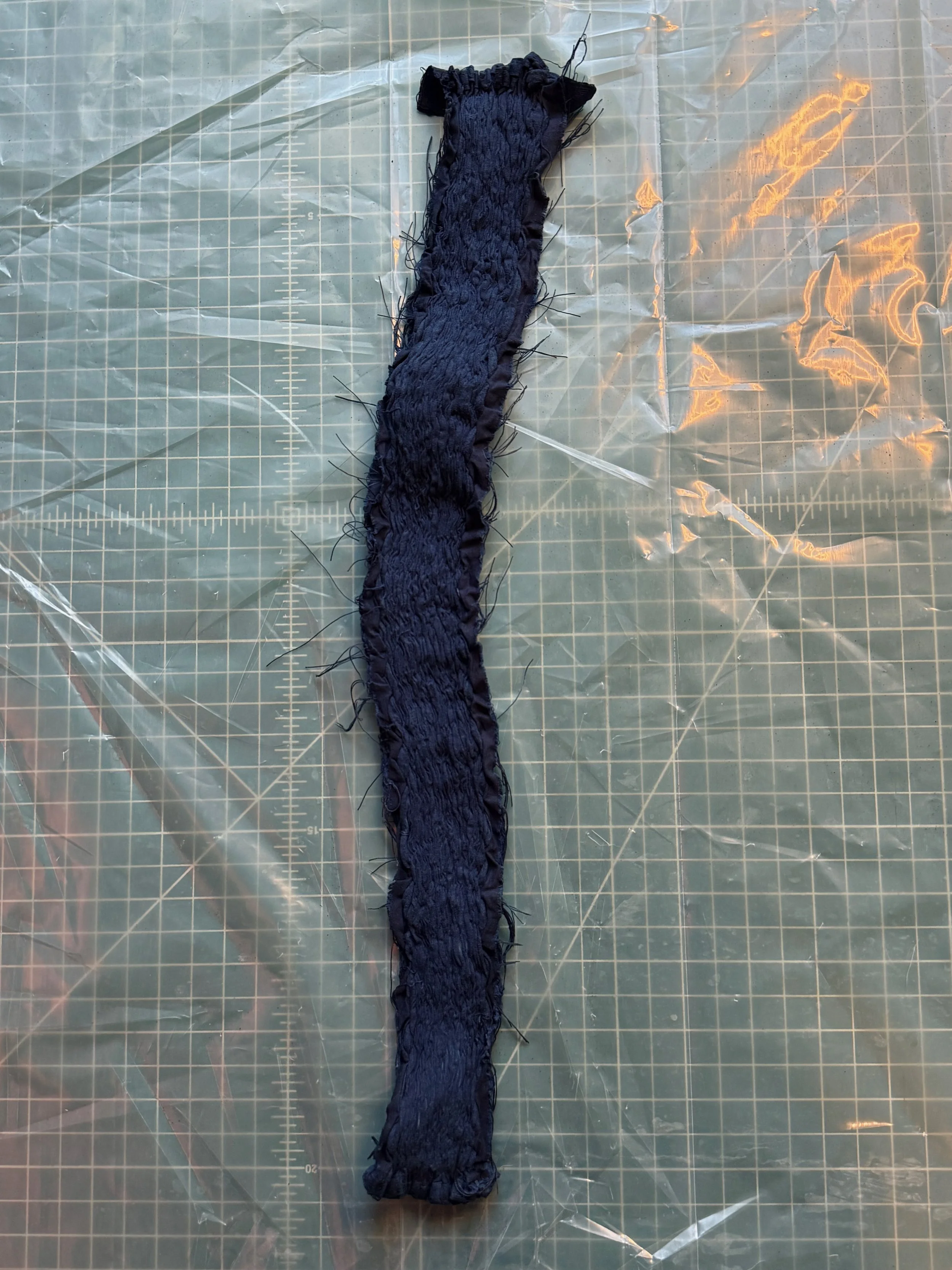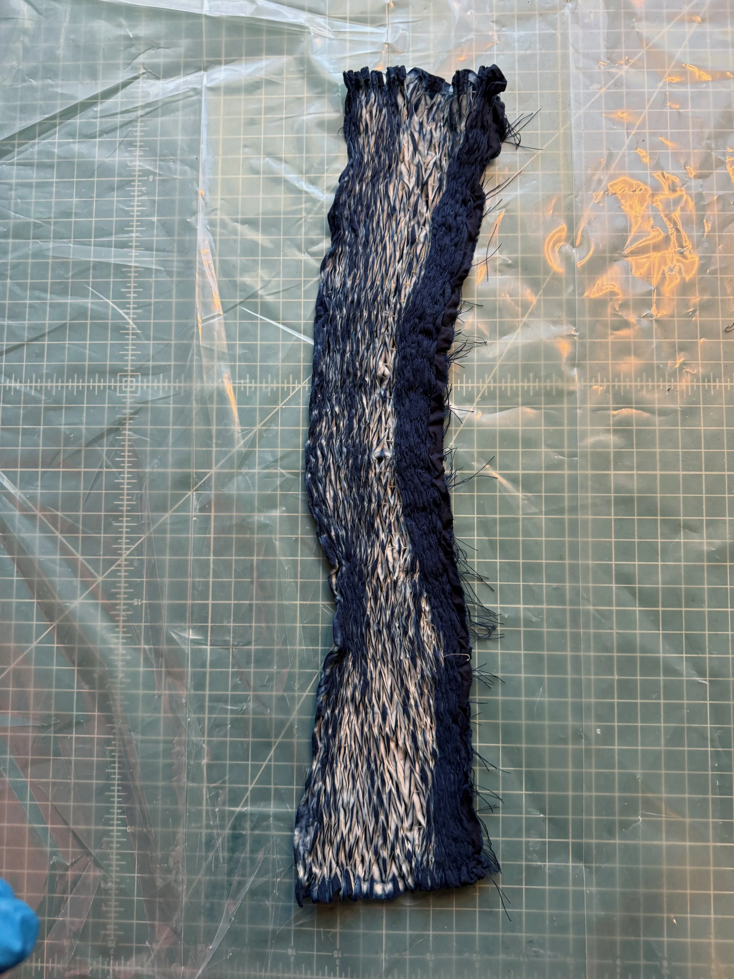 I dyed this 5 times in my Indigo vat. I love the way this pattern pleated after the dyeing process, and I’m reluctant to press it so I have kept it as it is for now.